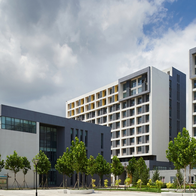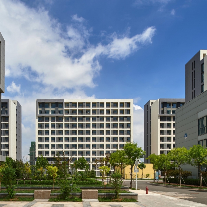 公寓立面設計以灰白兩體塊貫穿交錯咬合而成。南北兩主立面均在大體格調一致的前提下以三種層次疊加生成,頂部突出的元素且與整體校園的設計相呼應;餐廳及服務中心立面設計與公寓相協調又有創新,以一個灰色的主體量咬合著兩個白色的盒子,通過玻璃面的銜接,使它們之間的過度協調自然,新穎大方。廠房由四棟鋼結構和一棟砼結構組成,立面上灰白體量相互搭接,并在側面涂上不同的顏色以示區分,整體風格簡潔大氣,體現了工業建筑的科技感和現代感。