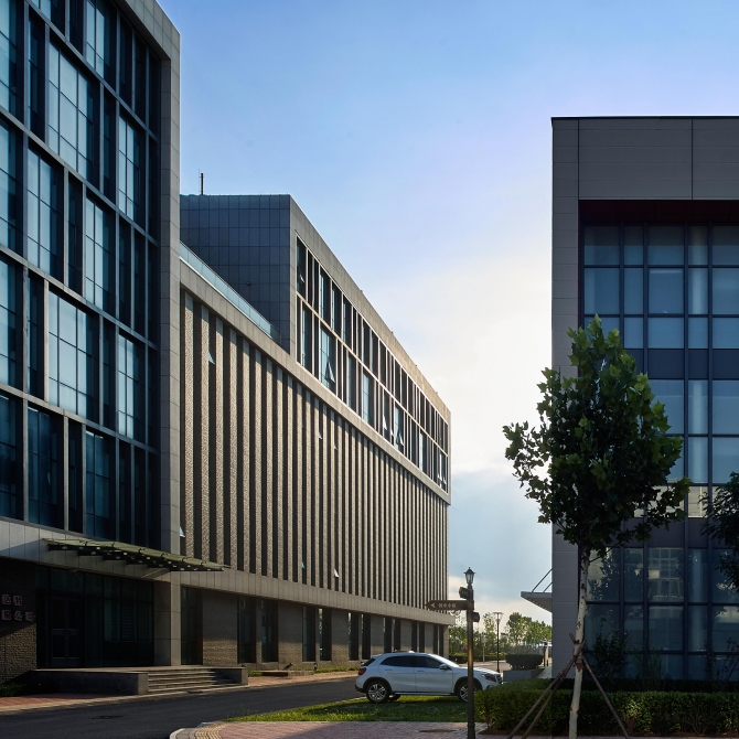北面生活區由四棟單身公寓和一棟食堂組成,連接南側廠房和研發辦公區,沿南外環路地塊最南側為教學區,由一棟教學樓和教學發展樓組成。教學樓和研發辦公樓在立面上采用了具有中國傳統書院氣質的青磚和白石材搭配的方式,創造出了一組既有傳統書卷氣又具現代科技感的的大學科技園建筑。體量上采用了化整為零的方式,建筑分為上中下三部分,灰白體塊相互穿插疊加,活潑自然,尺度宜人。