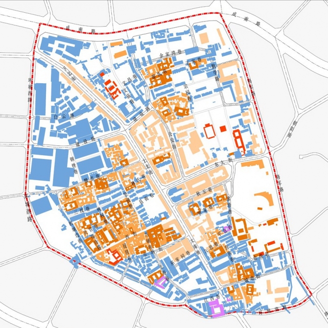 首先,對建筑保護與更新采取六類相應的措施,即保護、改造、拆除、移動、補缺、配套,簡要概括為“留改拆移補配”,同時完善古城設施和空間格局;