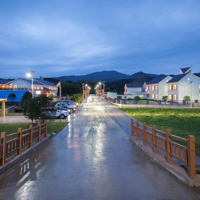 主要包括綜合服務中心和小學(含幼兒園),設計均采取化整為零的方法,通過體量打散使建筑尺度和布局肌理接近于臨近的聚落組團,尺度宜人的檐下、外廊及庭院空間,為使用者提供游憩與交流的場所。立面取自傳統(tǒng)民居風格,開窗兼顧功能需要與景觀視線,墻面采用實用經(jīng)濟的淺色涂料,屋頂采取與農(nóng)宅相同的深黑色釉面瓦。室外景觀尊重現(xiàn)有地形,盡量采用地方材料和植被,模擬自然的梯田景觀,使建筑同鄉(xiāng)村環(huán)境自然地融為一體。