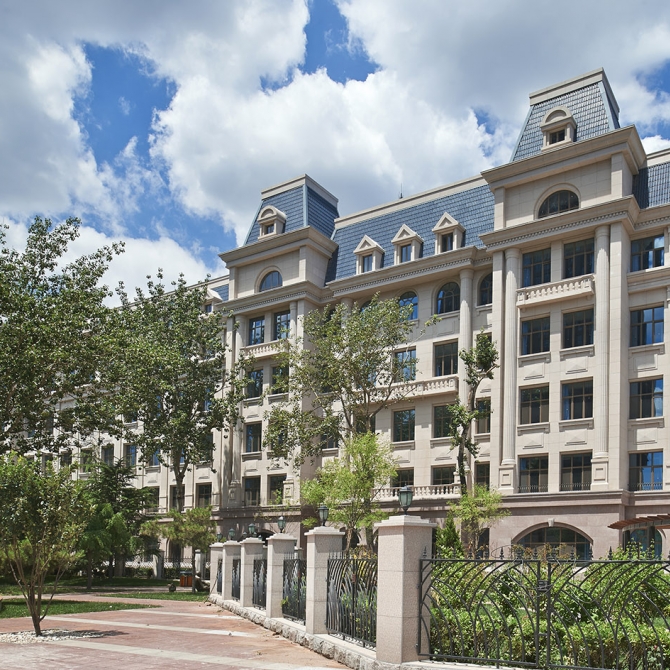 項(xiàng)目地處天津德式風(fēng)情區(qū),因此方案考慮之初就將立面定位于具有德式風(fēng)貌的外觀。各單體均采用簡(jiǎn)化的歐式立面,保證基本風(fēng)格與周邊建筑統(tǒng)一的前提下,又對(duì)部分重點(diǎn)部位,如街巷轉(zhuǎn)角處、校園入口、主要的視覺(jué)焦點(diǎn)處等進(jìn)行了重點(diǎn)處理,提升了校園的整體形象。