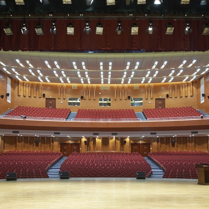 遼寧交通高等專科學(xué)校學(xué)生活動(dòng)中心為包含禮堂的兩個(gè)相對(duì)獨(dú)立的功能體組合在一起,其中學(xué)生活動(dòng)中心位于建筑南部。鑒于主要人流方向的考慮,將不同使用需求的人流有效分開(kāi),首層?xùn)|南側(cè)為學(xué)生事務(wù)辦理大廳,西南側(cè)多功能廳即可作為會(huì)議活動(dòng)等功能空間使用,更可通過(guò)內(nèi)廊與禮堂后臺(tái)連通,必要時(shí)可作為大型演出候場(chǎng)之用,極大程度上合理利用空間,各空間均有獨(dú)立出入口避免人流交叉相互干擾。禮堂位于建筑北部,主入口位于東側(cè),與學(xué)生宿舍區(qū)距離26米,前區(qū)形成開(kāi)闊廣場(chǎng),便于大量人流集散。