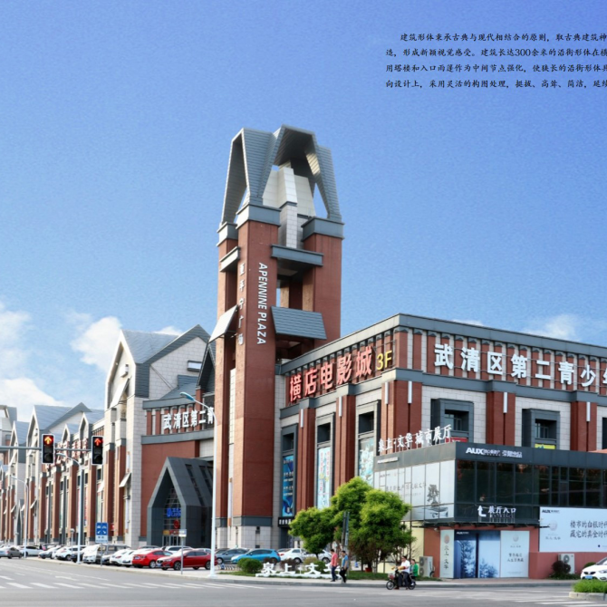 該商業廣場地塊位于天津市武清區,緊鄰佛羅倫薩小鎮,周邊有多個居住區圍繞,該項目既有區域級商業綜合體的定位,又為周邊密集居住區提供日常娛樂、學習、購物、體驗的社區商業的服務職能,具有區位重要性和功能的綜合性。