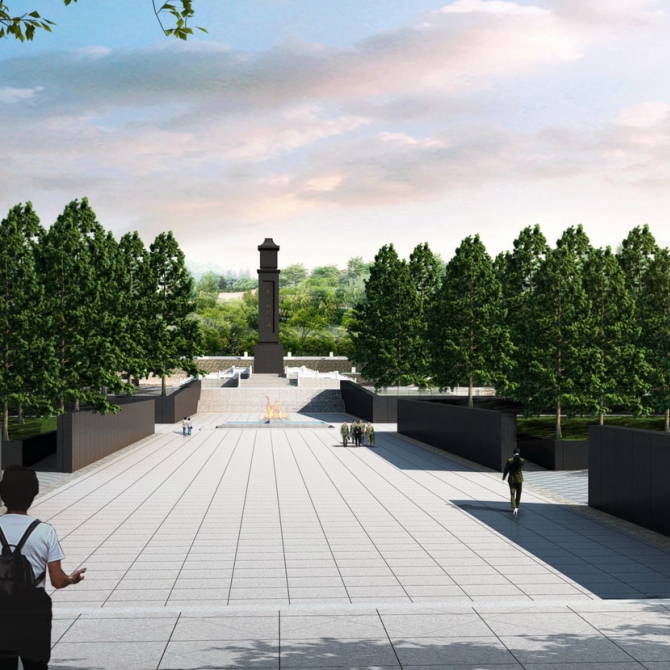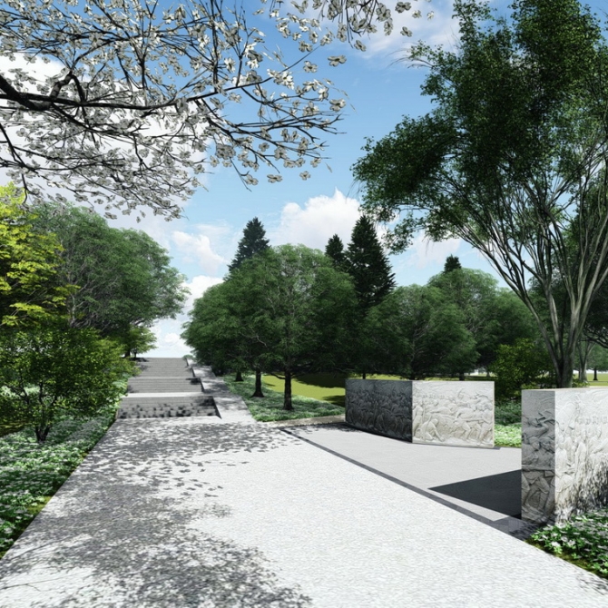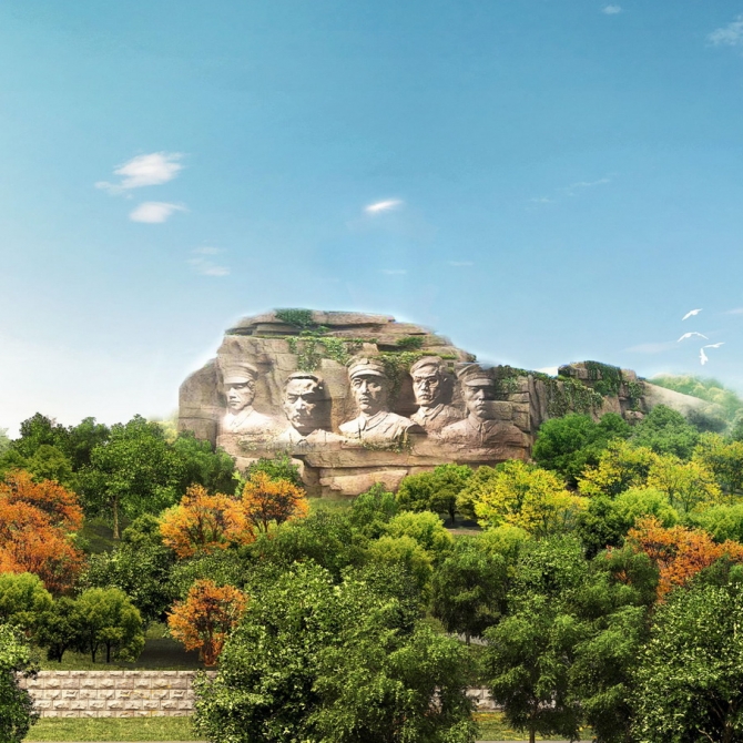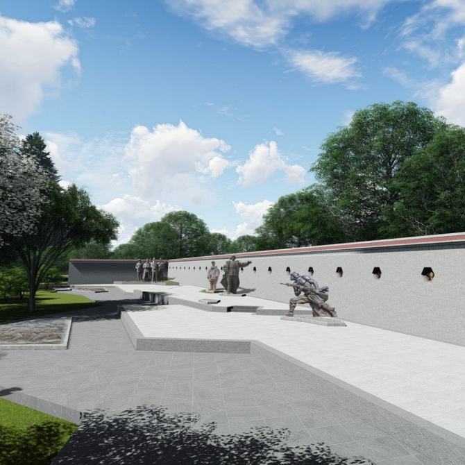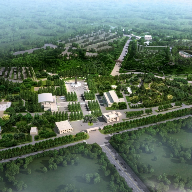 以“國家的記憶、民族的豐碑”作為設計主題,規劃中突出烈士陵園的緬懷之境;完善相應的功能及配套設施;分析園區制高點與城市道路之間的視線關系,以烈士主題雕塑與園區服務建筑相結合的形式,塑造城市新望點,提升園區影響力。