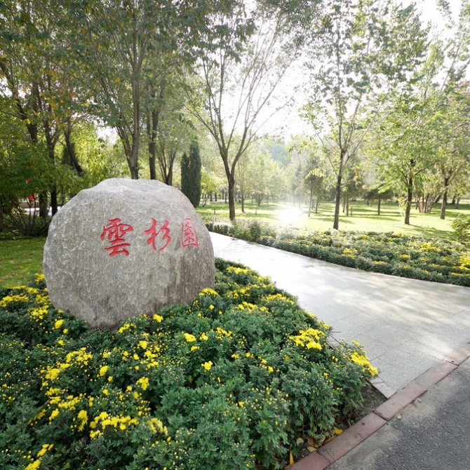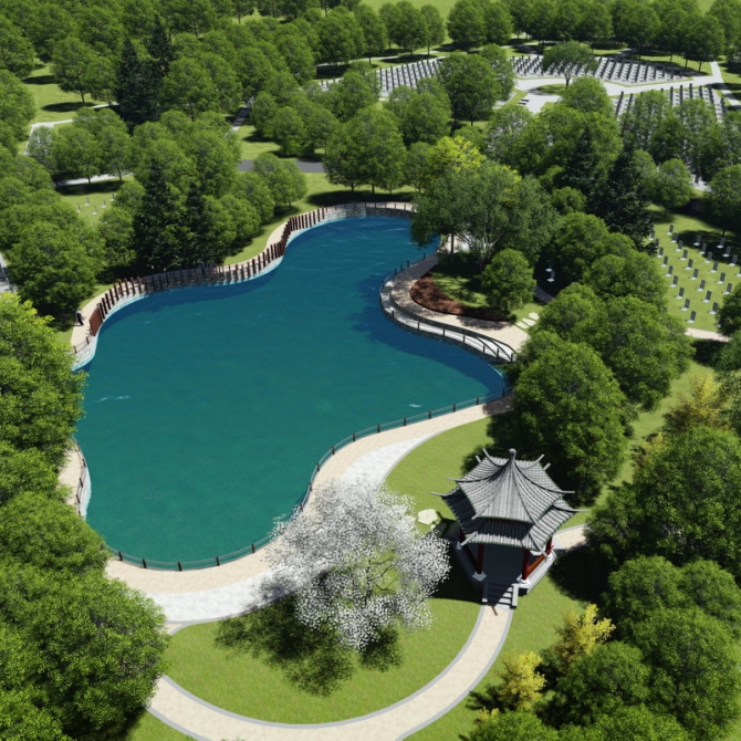 園區主入口到烈士紀念碑的主要紀念軸線設計保留原有古樹及兩側場地的原有肌理,同時利用下沉廣場、紀念景墻等元素,打造簡潔純凈的空間序列,營造肅穆的緬懷氣氛。陵區軸線兩側片區,現狀分布大量古樹、大樹,在合理保留的基礎上,完善教育展示與紀念林種植體驗功能,以曲線式路徑串接起各個節點。在墓園部分,結合未來建設容量,設置四個不同自然主題的墓園,與園區整體環境有機融合。