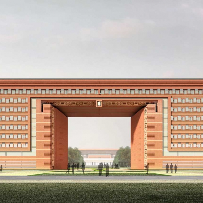 設(shè)計(jì)創(chuàng)新地提出了“躍龍門”的規(guī)劃布局模式。由行政辦公和實(shí)驗(yàn)樓共同形成校園入口主體大樓,并與圖書館、風(fēng)雨操場共同圍合出校園的主入口,打造了一個(gè)吉祥大氣校園主入口空間。學(xué)生經(jīng)過鯉池,穿過龍門完成升華,取自“魚躍龍門”的吉祥寓意。在大氣中彰顯浪漫情懷,在傳統(tǒng)中展露現(xiàn)代風(fēng)采。