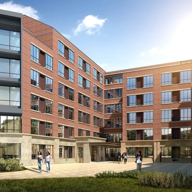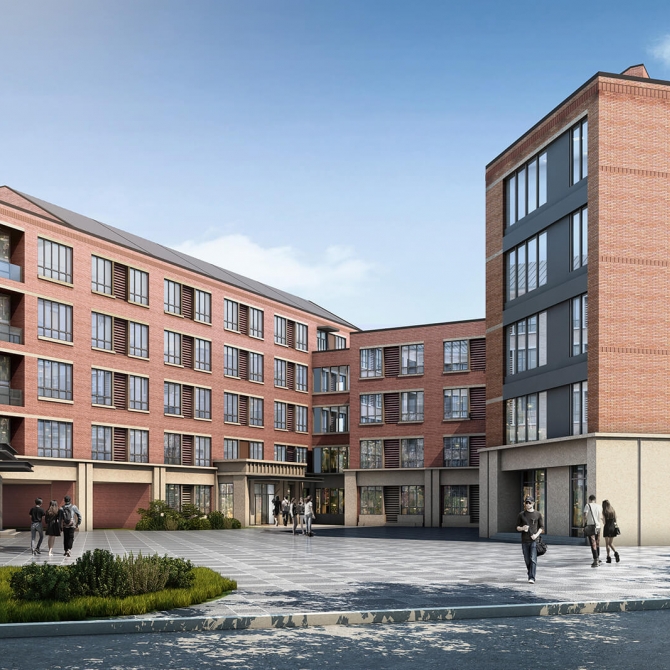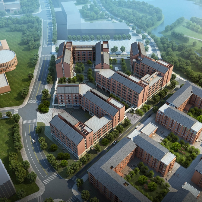 在建筑造型方面,采用與校區(qū)整體色調(diào)相協(xié)調(diào)的磚紅色。同時(shí)考慮項(xiàng)目東側(cè)已投入使用的博士生公寓為坡頂,而項(xiàng)目周邊均為平頂,采用平坡結(jié)合做為項(xiàng)目的屋頂形式。坡屋頂采用金屬屋面板,具有現(xiàn)代氣息。建筑形體富于變化,內(nèi)部界面豐富,通過局部里出凹進(jìn)的變化,改變宿舍建筑的單調(diào)的構(gòu)成形式。院落的塑造以及首層架空的處理,使建筑群體在立面規(guī)整的同時(shí),空間更加多樣化。