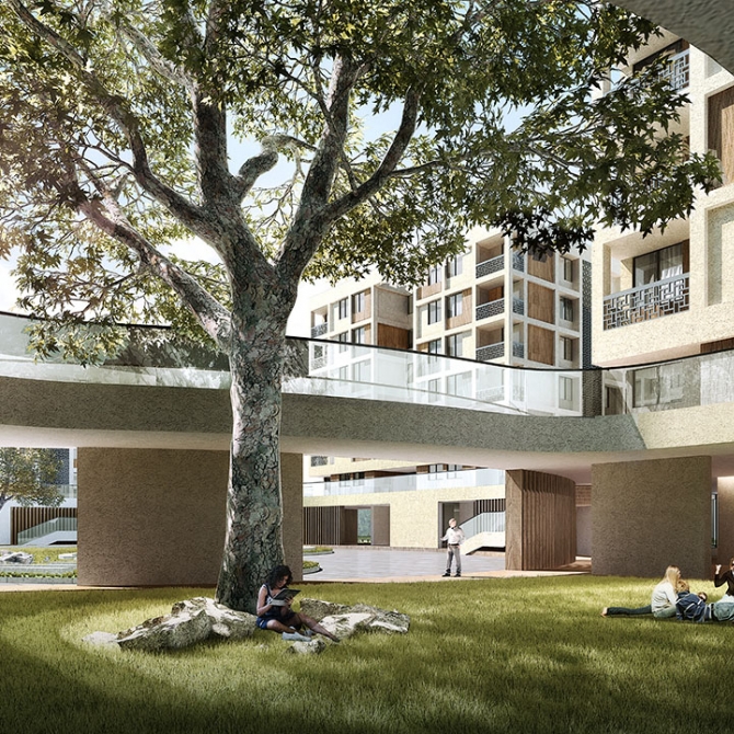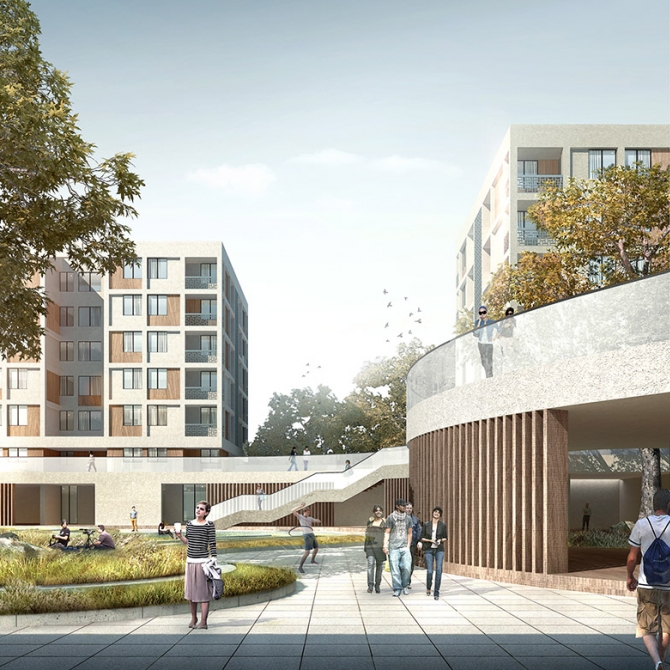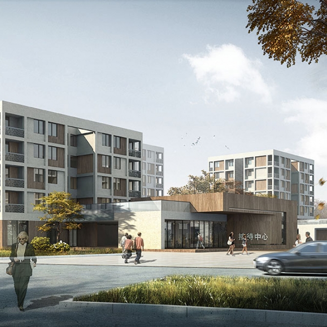 項(xiàng)目位于天津市西青區(qū)天津師范大學(xué)新校區(qū)內(nèi),總建筑面積12500平方米,滿足380位留學(xué)生入住。本案位于校園北側(cè),其主要人流來(lái)自南側(cè)教學(xué)區(qū)和生活區(qū)。廣場(chǎng)出入口處設(shè)接待中心,醒目便捷。廣場(chǎng)內(nèi)部實(shí)行人車分流,僅允許行人和非機(jī)動(dòng)車進(jìn)入,行人亦可通過(guò)首層架空灰空間到達(dá)校園主環(huán)路及校園濕地景觀。優(yōu)美弧線的室外觀景平臺(tái),宛如一條紐帶將錯(cuò)落有致的宿舍有機(jī)聯(lián)系到一起,內(nèi)側(cè)形成一個(gè)半圍合的景觀庭院。本案采用白色和仿木紋水泥纖維板作為建筑外檐材料。通過(guò)簡(jiǎn)潔的白色骨架,木色和白色相間的建筑墻面的設(shè)計(jì)元素和手法,體現(xiàn)中式匠心獨(dú)運(yùn)的文化內(nèi)涵。