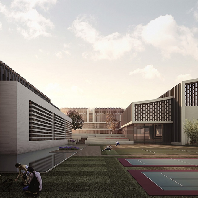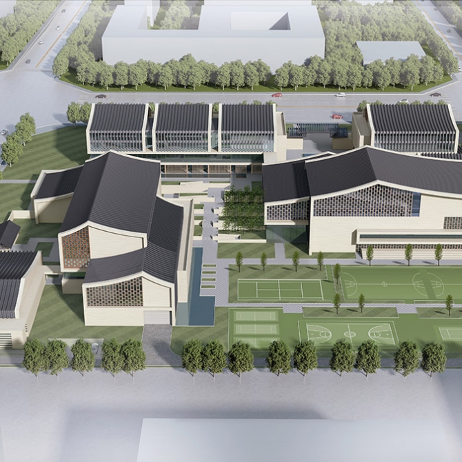 考慮到朝向及城市道路、噪音等影響,方案將老年大學獨立置于基地東北部,鄰城市次干道福泉路一側(cè),為老年人在喧囂鬧市中辟出安靜一隅。