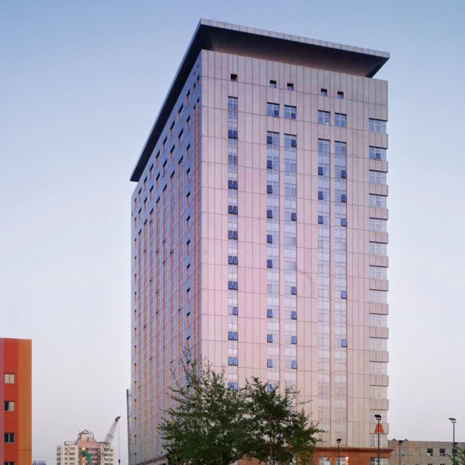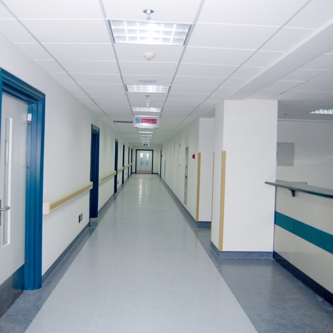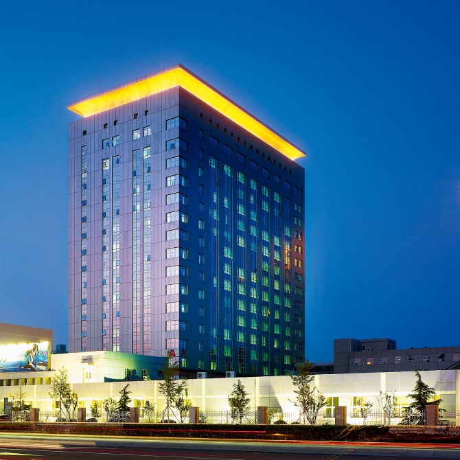 原住院樓地下一層,地上十五層,建筑面積17881平方米,床位數660張。接建設計以原有住院樓主體為依托,在北側和西側分別接建8.80米和9.10米的單跨同高建筑,建筑主體加至十七層,接建后總建筑面積32065平方米。一層除檢驗科和藥劑科外,增加了住院部獨立入口門廳;二至十六層為病房層,每層設一至兩個護理單元,采用島式布局,中心布置護理站、醫護辦公、附屬用房等,病房位于南、北、西三面。病房由原來的6人間(不帶衛生間)改為4人間或2人間(均帶衛生間),每層設重癥監護室,十六層設有套間病房。改造后總床位數增加為943床。各功能區垂直交通流線嚴格區分,做到人貨分流、醫患分流、潔污分流,快捷便利,互不交叉干擾。