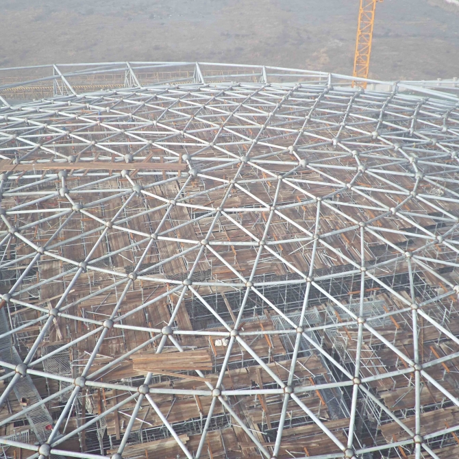 弦支穹頂撐桿上節(jié)點(diǎn)采用一種把球內(nèi)加勁板和斜拉索耳板合而為一的新型焊接節(jié)點(diǎn)構(gòu)造,避免了一般采用鑄鋼節(jié)點(diǎn)引起的工期長、造價(jià)高等問題。撐桿下節(jié)點(diǎn)采用一種性能優(yōu)于鑄鋼節(jié)點(diǎn)和焊接節(jié)點(diǎn)的鍛造節(jié)點(diǎn)機(jī)加工做法,特別是拉索分段節(jié)點(diǎn),通過機(jī)加工車出內(nèi)螺紋,直接與拉索端頭進(jìn)行連接,避免了拉索端頭耳板式的連接構(gòu)造,減少了傳力途徑,在滿足了結(jié)構(gòu)的受力性能的同時(shí),便于施工且經(jīng)濟(jì)性好。施工過程中實(shí)施跟蹤監(jiān)測,有關(guān)監(jiān)測結(jié)果指導(dǎo)屋面弦支穹頂結(jié)構(gòu)預(yù)應(yīng)力施工,保證了施工質(zhì)量與結(jié)構(gòu)安全。