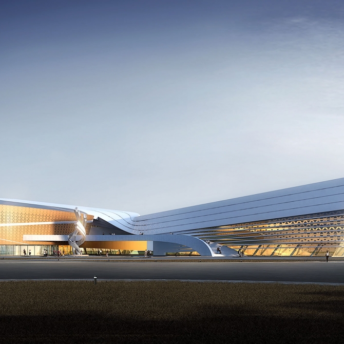 建筑方案以“新絲綢之路上的明珠”作為設計主題。方案完美地契合了長方形用地,基地南端擁有力量感與飄逸身姿的矩形體量舒展靈動,是對新絲綢之路的理想隱喻。水平的線條與建筑修長的體型相呼應,設計手法簡練一氣呵成。建筑的北側是一個橢圓形體量,氣勢恢宏造型獨特,猶如明珠的外觀在夜幕降臨、華燈初上之時璀璨奪目,彰顯了霍爾果斯市在新絲綢之路上的的顯赫地位。
