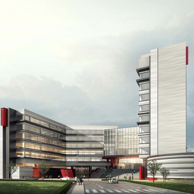 我們在設計中要充分考慮兩種基本模式的優缺點,有機整合兩種模式的優點,形成“三枝”層層跌落的組合布局模式,高分子工程科學與工程學院、材料與工程學院、待定學院各占一枝,交叉處為中心共享大廳。該科研大樓垂直的功能從公共開放到私密獨立順勢展開,形成從水平和垂直功能上的合理布局。北高南低的建筑形體,節省了最寶貴的校園用地,為南側未來校園再次建設創造最有利的基礎。西側高東側低的形體變化使得建筑在城市道路上具有標志性,對校園建筑形成最小的壓抑和影響。