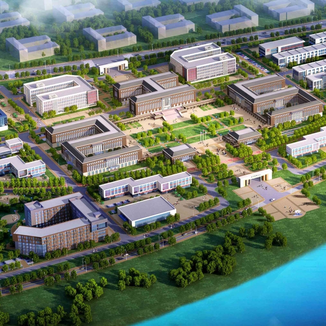 南北兩個廣場及中心廣場構成校園南北軸線上的重要的景觀節點,其中以不同的鋪地、綠地、植樹、休閑步道的搭配,營造出豐富多樣的景觀環境。中心廣場中廣闊平坦的草坪與連續的柱廊限定出主要的活動空間,培訓樓、教學樓以及宿舍單休構成校園的庭院空間,郁郁蔥蔥的庭院為師生提供優美寧靜的休息集會、交流學習的空間場地。