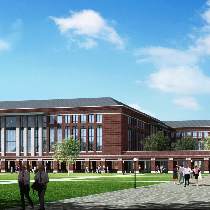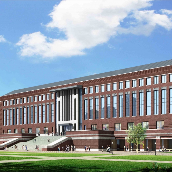一中心:由行政樓、科研樓、圖書館及兩個實訓樓限定出一個方形活動場地,進而四周用柱廊形成建筑之間的連續過渡。