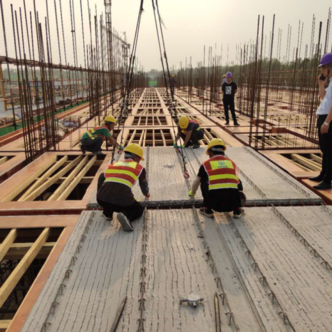 疊合板按照單向受力模型進行設計,最大程度節約了傳統樓板木模的使用,改良了樓板支模的施工工藝,縮短了施工周期,改善了施工環境,提高了施工的質量和精度。