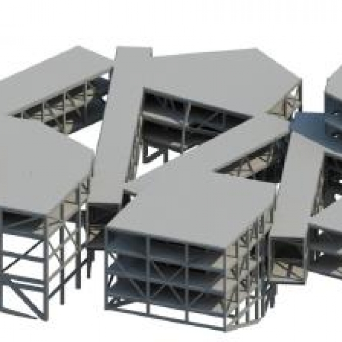 天津茱莉亞音樂學院體型復雜,結構通過5個2層高的連廊將四個單體間連成整體,連廊位于2層~3層,通過自身兩側的次桁架擱置在兩榀主桁架上,主桁架通過柱子和支撐傳遞豎向荷載。
