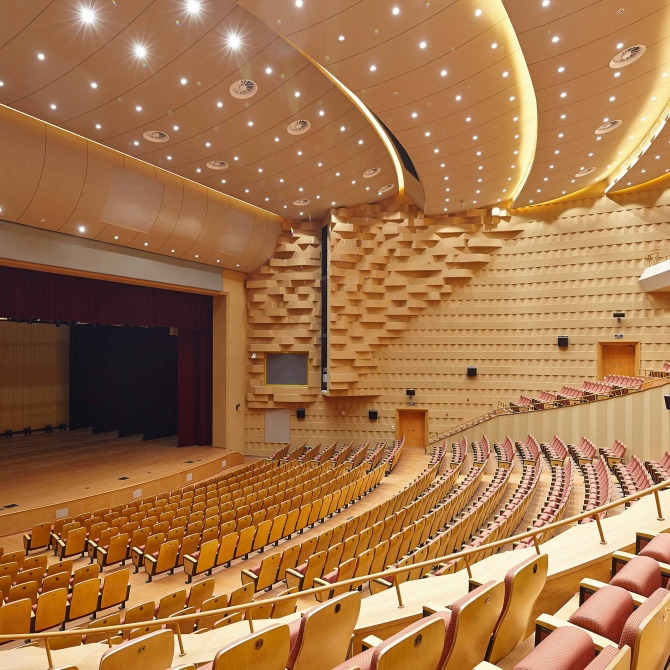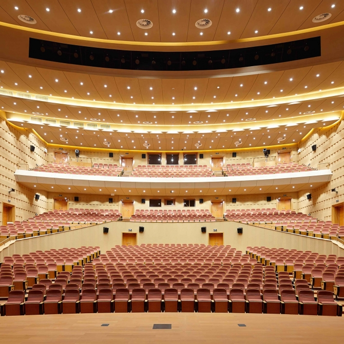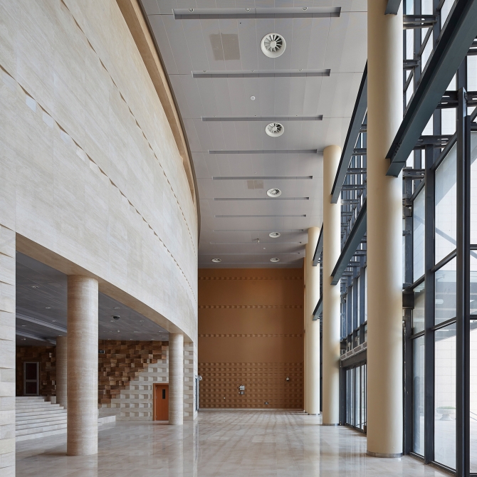 北京語言大學綜合樓位于校園內南門西側、校園中部,教學、宿舍、運動三個區域的交界處原食堂和禮堂范圍,用地面積1.3萬平方米。基地西北部有一現狀綠地需予以保留。整體建筑包括1200座劇場、辦公樓和食堂三個部分,地上建筑面積6.5萬平方米。