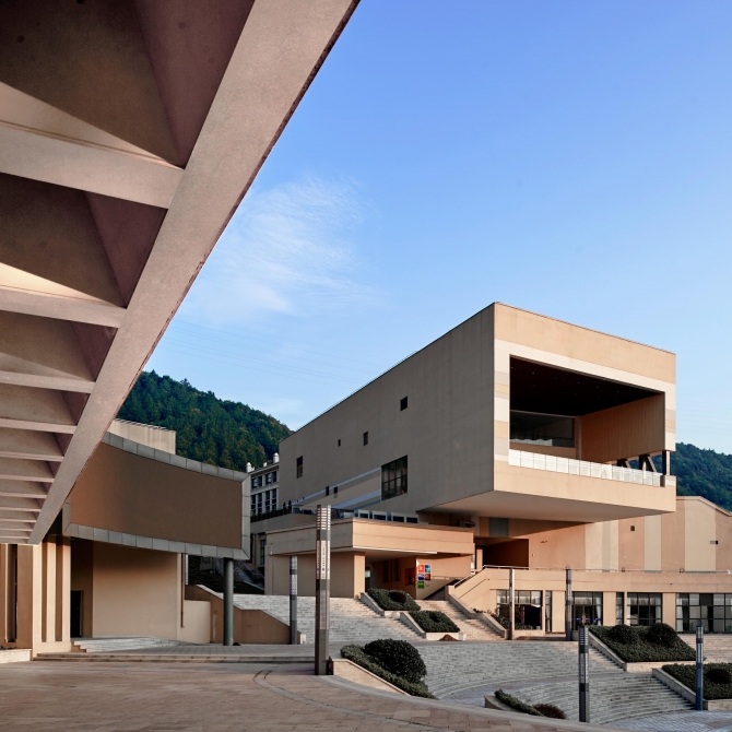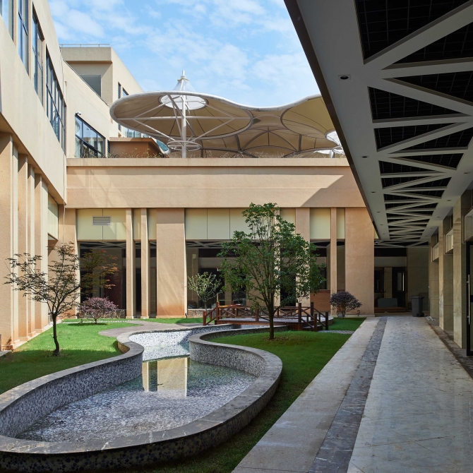 學生活動中心建設用地位于園區的東西主軸線與南北景觀大道交叉點上,風景宜人,處于園區的最佳位置,可供整個園區學生使用,風景宜人。北側國際學校區,南側普通教學區,東側景觀大道,西側為自然山體。總體地勢呈西高東低,東西高差9m。