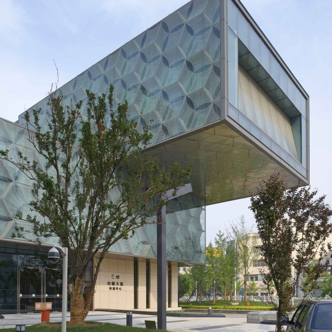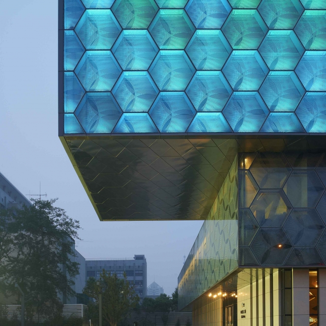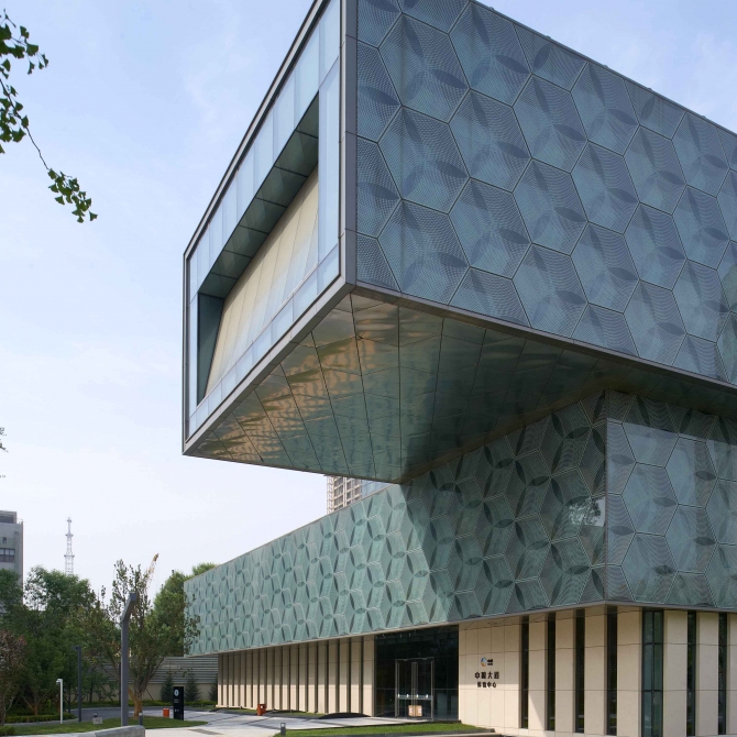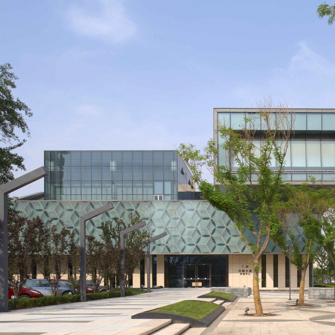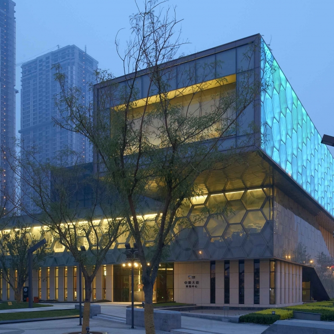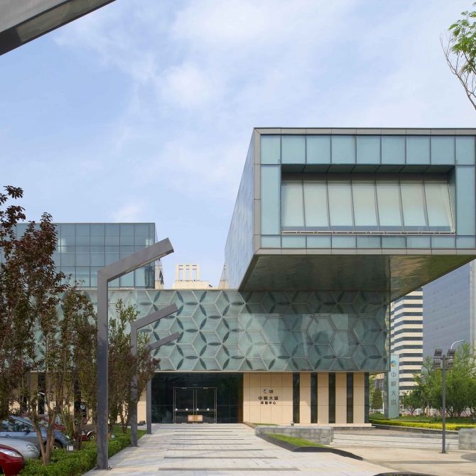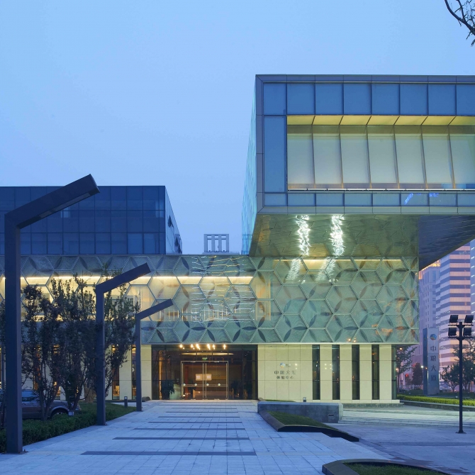 中糧天津六緯路項(xiàng)目體驗(yàn)中心用地為“L”形,建筑形體根據(jù)地形條件設(shè)計(jì)為依地形盤旋生長(zhǎng)的形式,形成內(nèi)院和共享中庭,提供模型展示和顧客休息場(chǎng)所,退讓的距離也減少了對(duì)周圍既有建筑的影響,并形成了環(huán)狀的消防車道。主入口設(shè)在西側(cè)面向六緯路和地鐵站,入口大氣明顯,起到引導(dǎo)顧客流線的作用。    建筑立面采用玻璃幕墻形式,局部外墻采用干掛石材,以體現(xiàn)質(zhì)感和力度感。玻璃幕墻采用雙層幕墻與單層幕墻相結(jié)合的形式,依據(jù)建筑體量的盤旋生長(zhǎng)的形式采用雙層正六邊形幕墻加以突出,體現(xiàn)建筑的流動(dòng)性。雙層玻璃幕墻形式以中糧集團(tuán)標(biāo)志為設(shè)計(jì)原型,以正六邊形彩釉玻璃加以圖案修飾予以體現(xiàn),充分體現(xiàn)建筑的個(gè)性化、標(biāo)識(shí)性,展示產(chǎn)品形象,體現(xiàn)公司實(shí)力。