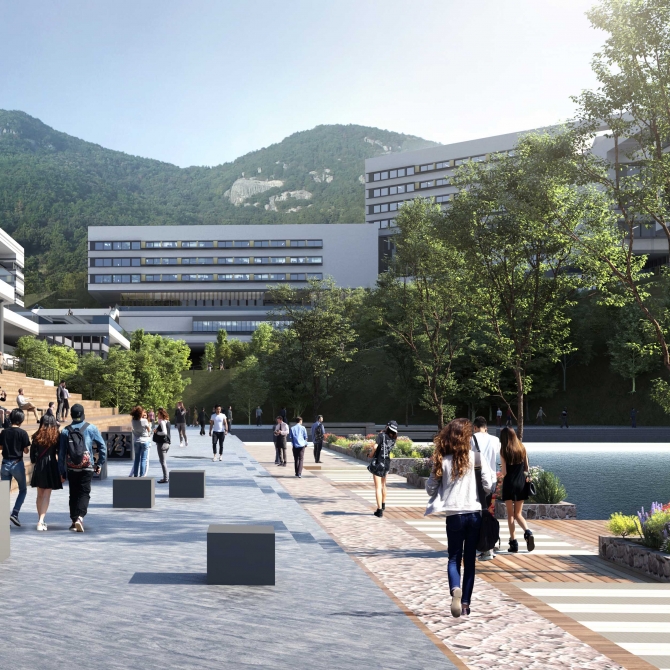 北側的教學生活區為學校的主體功能空間,建設用地沿外環路橫向展開,“一核兩園 展翼齊飛”的規劃格局,將使這里成為電力科技知識的殿堂,也成為學生美好校園生活的空間載體。“一核”, 為學術共享核,“工匠精神”大講堂及圖文中心位于校園中央,“能量環”的設計理念助力它成為整個校園的精神高地和學術燈塔。綜合實訓、基礎教學、公共創新實驗中心在大講堂西側沿山體帶狀展開。行政接待中心及電力科技博物館位于入口東側。整個學術共享核心建筑群結合山體臺地拾級而上,烘托出巍巍學府氣息。“兩園”為東西學生生活園,“西園”是由電力工程學院的學生生活、專業實訓、餐飲服務以及主體育場和學生文體活動中心共同組成,圍繞自然山谷的山水環境,創造出美好而有趣的山地校園生活空間。“東園”是由動力、信息、經管等綜合學科組團的學生生活、專業實訓以及輔體育場共同組成。東西兩園分別連接南側的校企互動建筑群與公共教學實訓區,形成適合山地校園地形特征,經濟合理,并且符合動態生長、分期建設策略的帶狀展開的校園建筑群,創造出“一核兩園 展翼齊飛”的整體校園空間態勢。