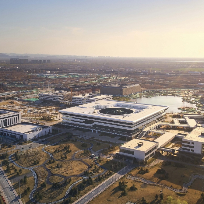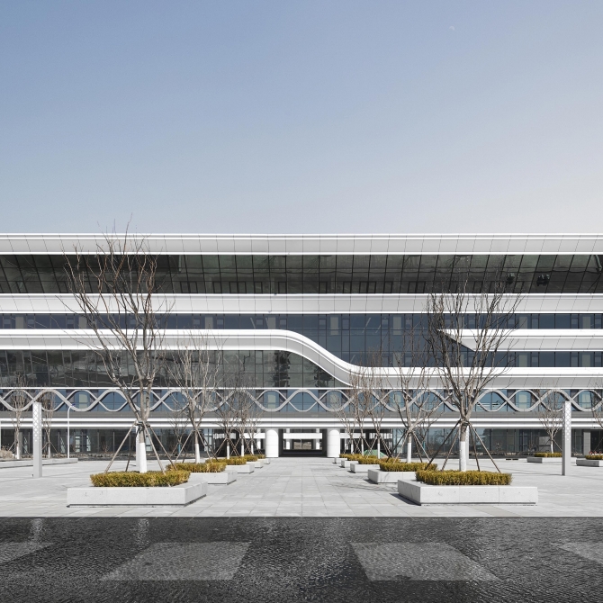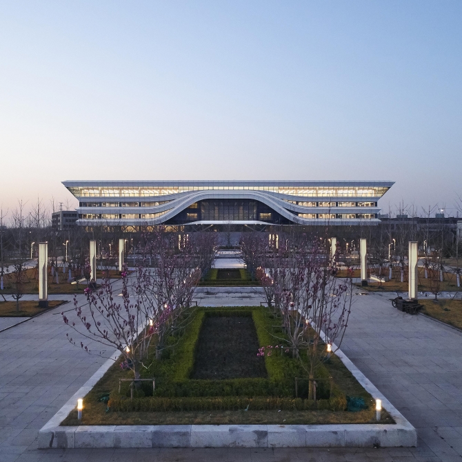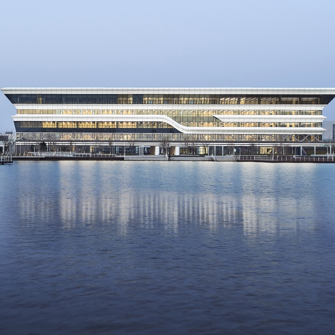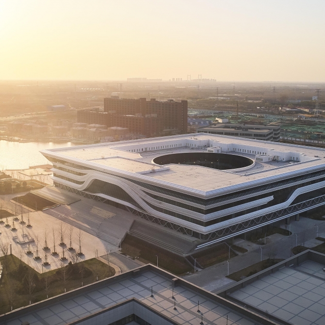 我們采用最純凈的方形體量,用最簡單的體量形成鮮明的場所控制力。作為校園核心的建筑,純粹的方形體量既是南側(cè)禮儀廣場的底景,也是西側(cè)景觀湖面的底景,同時(shí)也是北側(cè)、東側(cè)靈動的建筑群的環(huán)繞核心。圖書館內(nèi)院是簡潔的圓形,方圓之間創(chuàng)造豐富的交流交往空間。