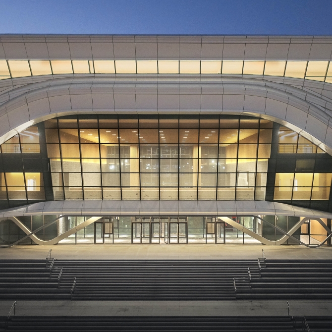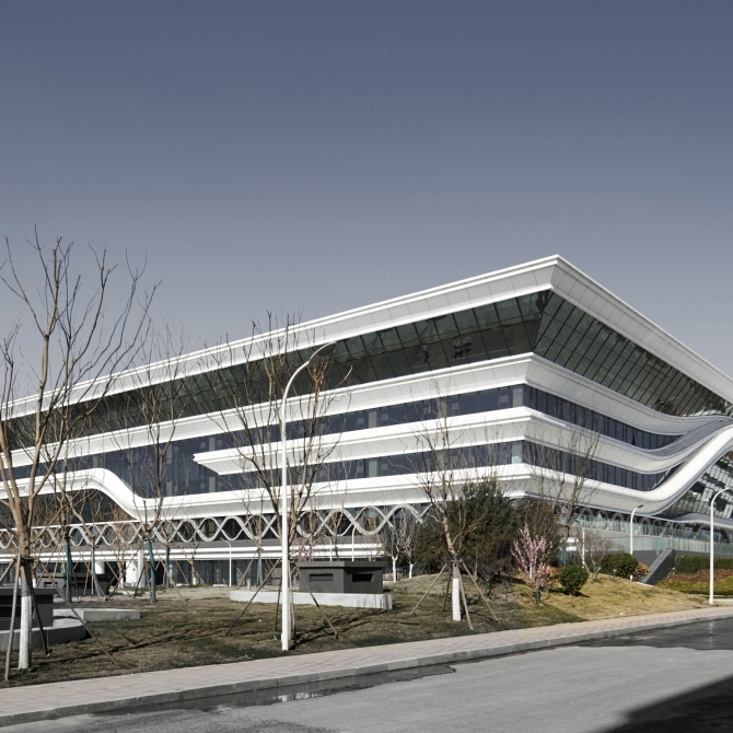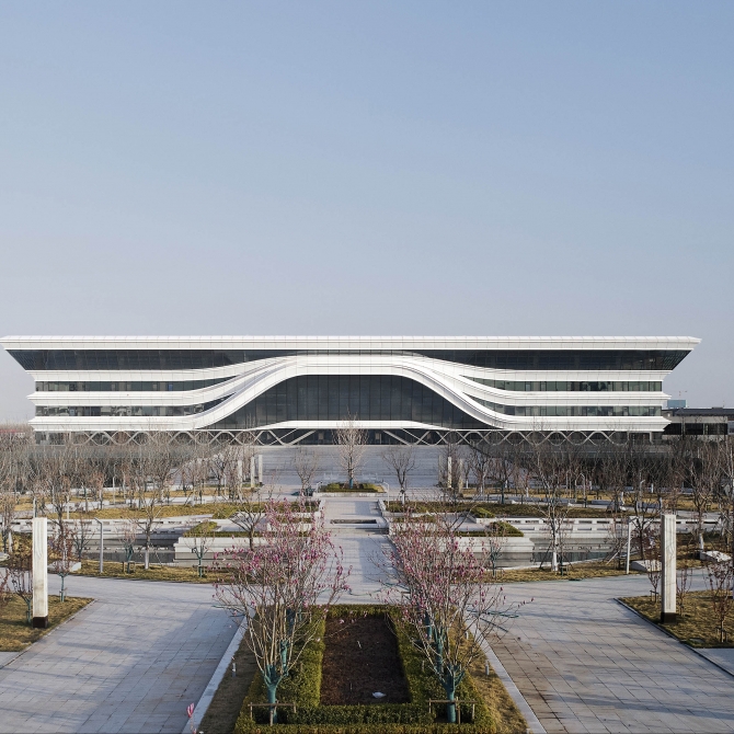 整個(gè)建筑形體又并不是一個(gè)簡單的方形體塊,而是由下而上做了一個(gè)升騰、放大的體量變化。圖書館建筑在新校園中、在濟(jì)南西區(qū)的磅礴荒野中蓬勃生長起來,非常符合這樣的場所氣質(zhì)。同時(shí)這種氣質(zhì)與大氣的齊魯大地傳統(tǒng)文化一脈相承,具有強(qiáng)烈的精神震撼力、空間感染力和地域吻合度。建筑立面的層疊線條抽象地傳承了中國山東傳統(tǒng)文化建筑的氣韻。醫(yī)學(xué)之冠,給了山東第一醫(yī)科大學(xué)一個(gè)雅俗共賞地美好的寓意,她使建筑不再是簡單幾何空間形式,給圖書館純凈的方形體量一種精神的賦能。