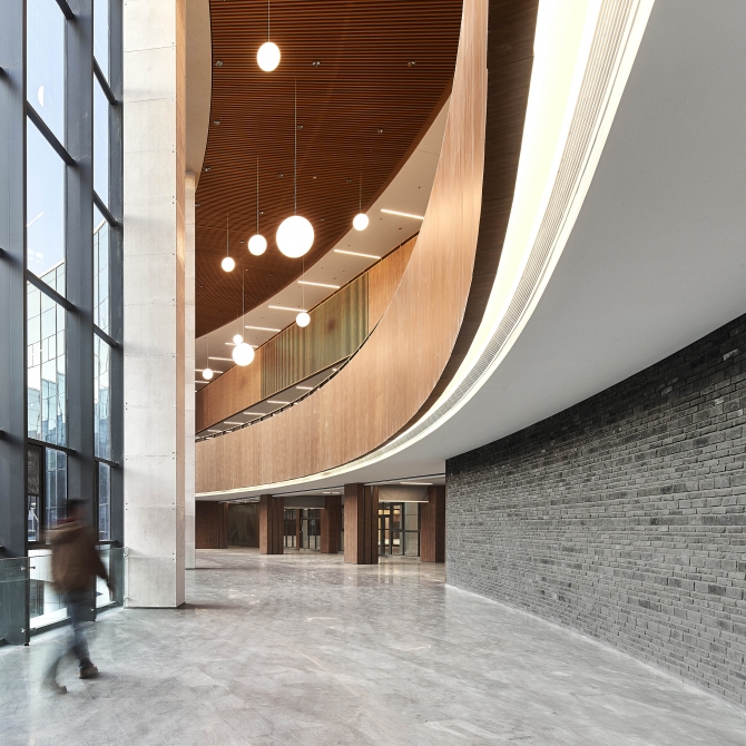 當(dāng)然,醫(yī)學(xué)之冠不僅僅包括場所育人的精神力量,更重要的是包括實(shí)事求是真正創(chuàng)作出能夠停留的、交往舒適的閱讀和交流交往空間。大學(xué)時(shí)代是學(xué)生由學(xué)校走向社會的重要過渡時(shí)期,學(xué)生不僅需要通過專業(yè)的學(xué)習(xí)走向?qū)I(yè)的道路,更需要提升交流交往能力,更成熟地走向社會。從外部看,宏大的敘事性建筑形態(tài)控制住整個(gè)校園外部環(huán)境,而建筑內(nèi)部,則力求創(chuàng)造出細(xì)膩柔和的學(xué)生交流交往空間氛圍。室內(nèi)采用柔和溫暖的木色和傳承于濟(jì)南當(dāng)?shù)匚幕那嗷疑u,將帶有濟(jì)南傳統(tǒng)街巷意味和尺度的空間,抽象并轉(zhuǎn)譯到圖書館室內(nèi)空間塑造中,在7萬平米的大型圖書館中創(chuàng)造出細(xì)膩柔和、舒適宜人的小尺度空間氛圍。同時(shí)結(jié)合圓形內(nèi)院創(chuàng)造出豐富的交流空間,給學(xué)生一種舒適、沉靜的環(huán)境體驗(yàn)。圖書館作為教學(xué)、生活以外的校園第三空間,不僅承載著看書自習(xí)等功能,同時(shí)很大程度上承載著學(xué)生時(shí)代珍貴的同學(xué)之間的交流交往功能。細(xì)膩生動、有一定文化韻味和生活情趣的交流交往空間,與宏大的帶有精神賦能的敘事場景共同使圖書館承載起教書育人,場所育人的重要作用。