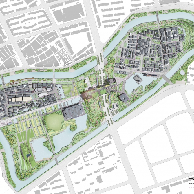 元寶島是楊柳青大運河國家文化公園的核心區,是集中展示明清天津運河文化盛景的全域、全時、全景、全要素的國際文旅目的地。我們致力于打造一座以運河文化和楊柳青文化為主題的活態博物館,方案從記錄著元寶島過去痕跡的歷史照片入手,以“再生”為核心概念,根據不同地塊的特質分別通過再活化、再組織、再開發的方法,進行再組織的。恢復過去這片土地上的濕地范圍,恢復原景觀,重現過去的院子或道路的記憶構成整體組織。置入與大運河與楊柳青文化相關的業態單體,恢復場地歷史地文的記憶。設計中處處體現著生態優先、本土化、文化融合、以人為本的原則。
