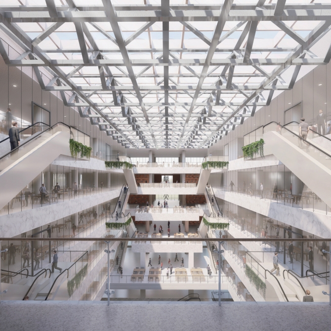 本項目是啟動區城市級標志建筑,與南區城市級標志建筑共同組成總部商務片區的南北雙核,形成片區的第一天際線。由三棟核心建筑塔樓圍合形成開闊的城市廣場,結合小街密路的城市肌理,以及地上地下一體化的空間設計理念,全力打造極具城市名片形象的門戶建筑群。