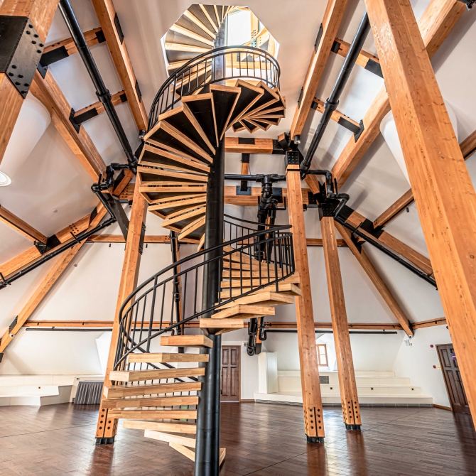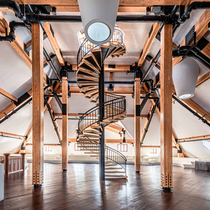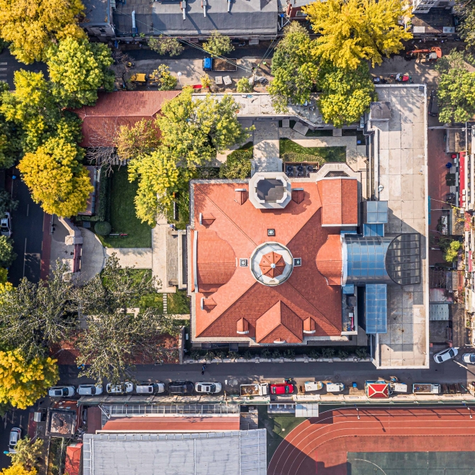 除了對主樓進行常規的結構加固、修繕以外,我院創新采用膠合木結構對地震時損毀的主樓坡屋頂及八角涼亭進行了復原設計,恢復其歷史樣貌的同時將復原的屋頂內部空間打造為企業家俱樂部。在主樓和后樓間使用玻璃連廊進行連接,進一步增加了使用面積和公共空間。